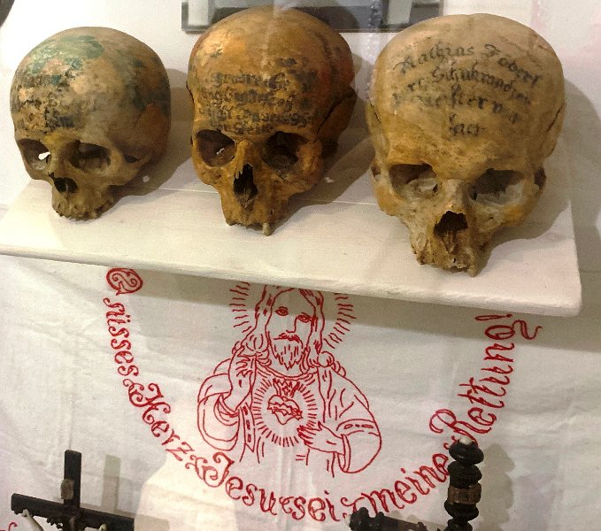 Eine etwas gewöhnungsbedürftige Art des Totengedenkens (Totenschädel sind mit Namen versehen).